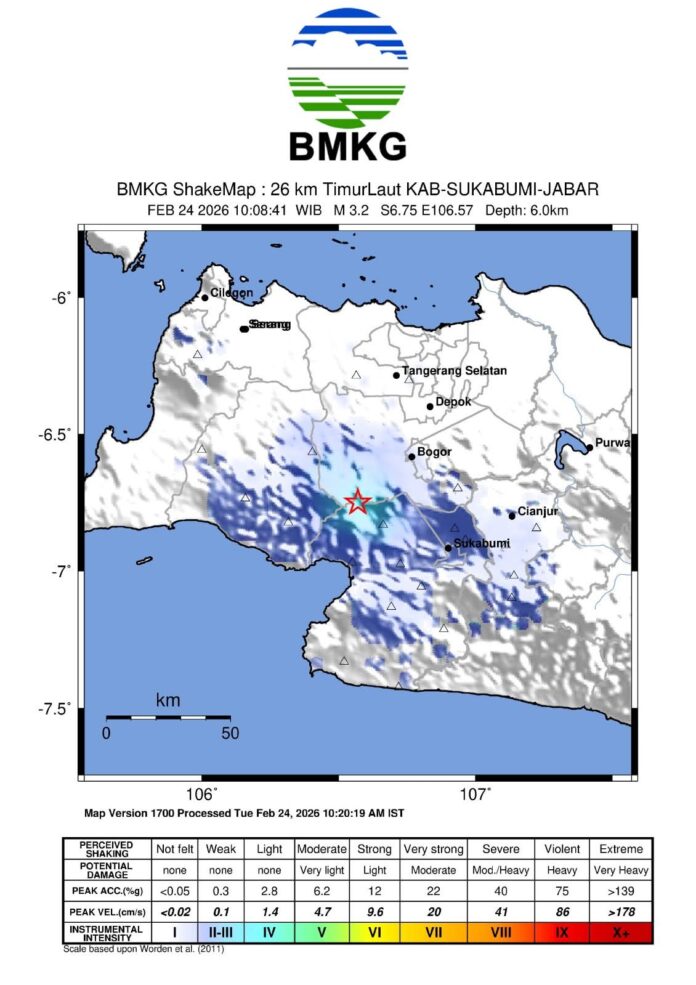 PINISI.co.id- Hari Selasa, 24 Februari 2026 pukul 10:08:41 WIB, wilayah Kabupaten Sukabumi, Jawa Barat dan sekitarnya diguncang gempabumi tektonik. Hasil analisis BMKG menunjukkan bahwa gempabumi ini memiliki parameter update dengan magnitudo M=3,2. Episenter gempabumi terletak pada koordinat 6.75 LS dan 106.57 BT, atau tepatnya berlokasi di darat pada jarak 26 km TimurLaut Kabupaten Sukabumi, Jawa Barat pada kedalaman 6 km.