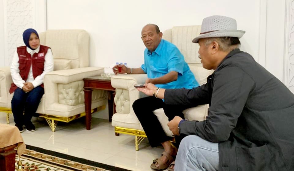 Bupati Langkat Syah Afandin (tengah) saat menerima Tim Bencana KKSS Eptati Kamaruddin (kiri) dan Andi M Hasbi (kanan).